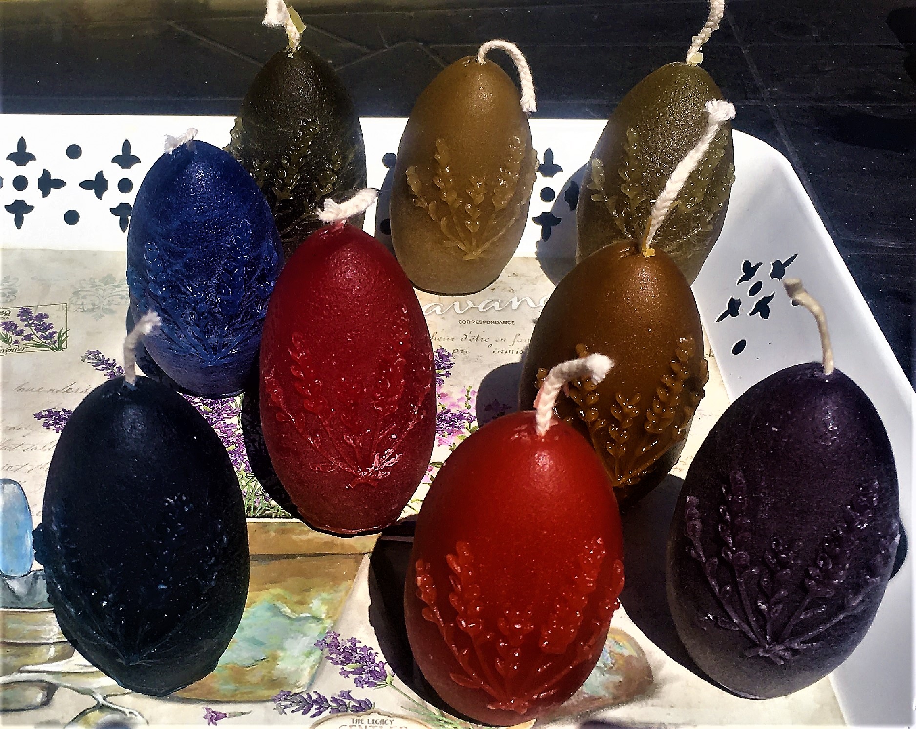 Huevo con motivo flor de lavanda hecho de cera de abejas y diferentes colores.